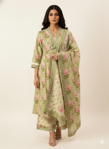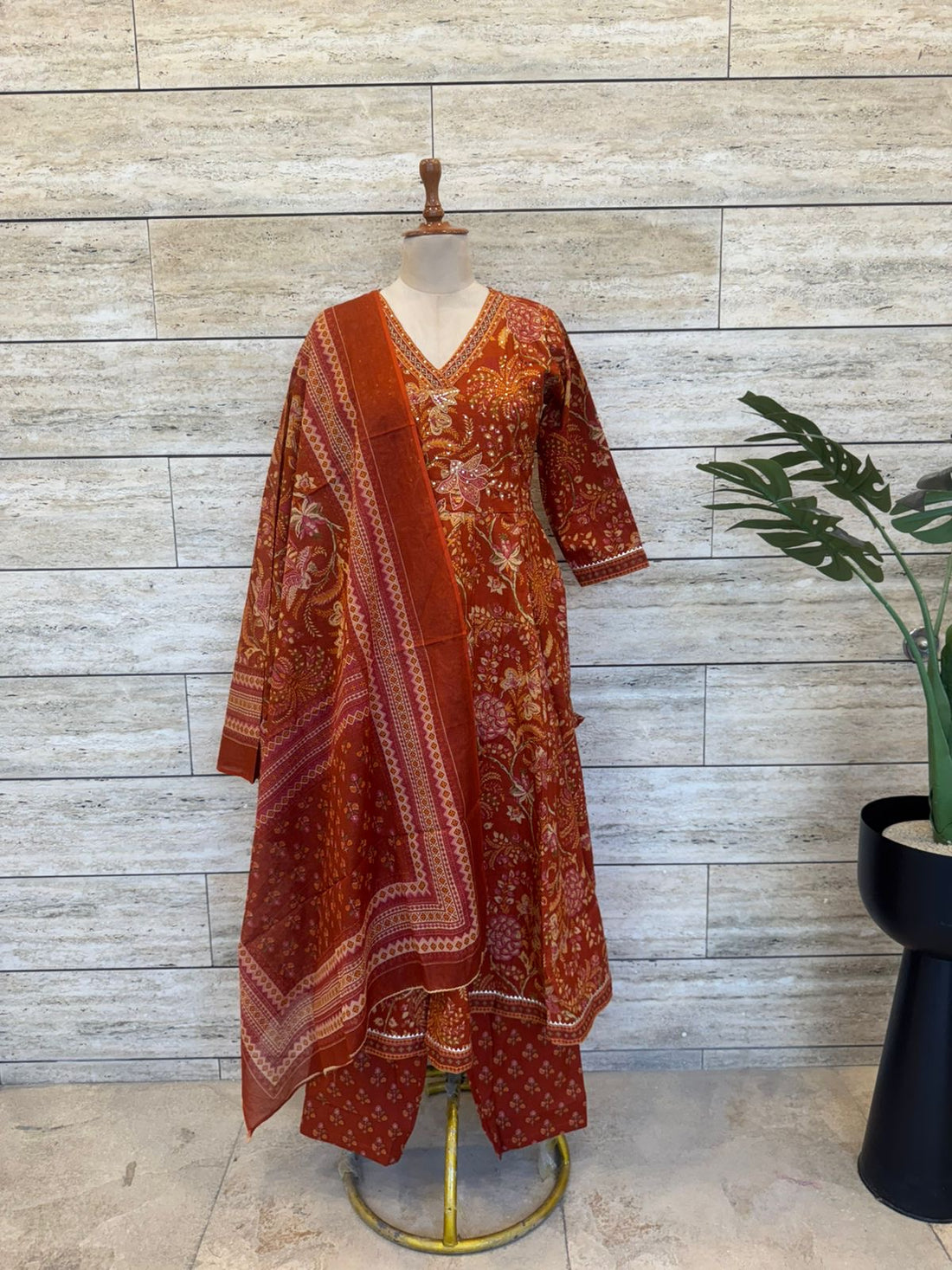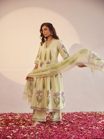 Pure Cotton A Line Floral Print Anarkali Dupatta Set With Palazzo CS0221