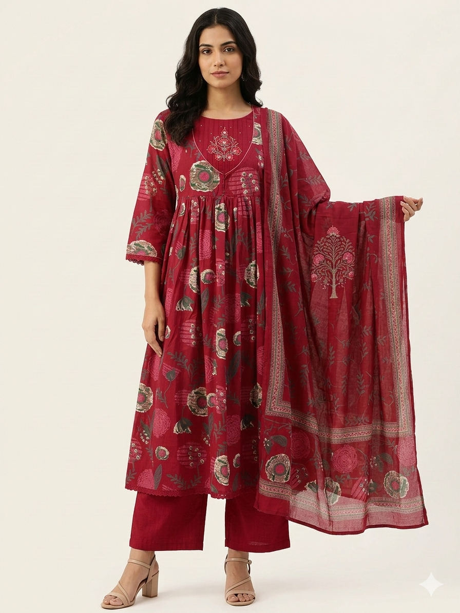 Pure Cotton A Line Anarkali Floral Print Dupatta Set ANKO38