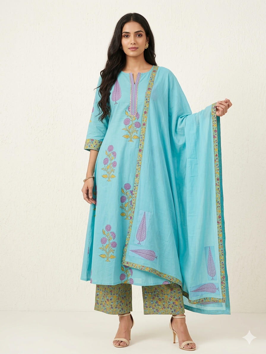 Pure Cotton A Line Block Print With Patch Work Dupatta Set CS0260
