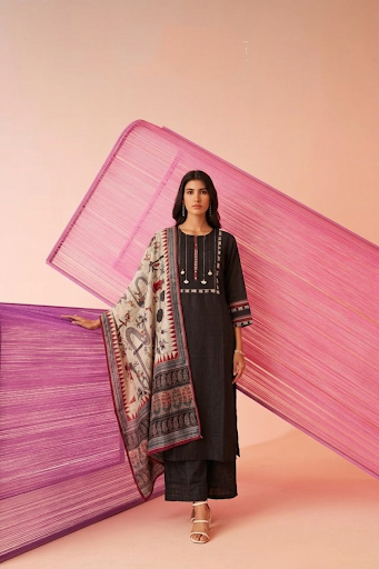 Pure Muslin Three Piece Dupatta Set With Embroidery MS004
