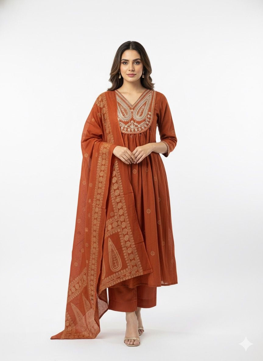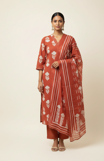 Cotton three piece hand block print dupatta set in three different shade having two tone effect.