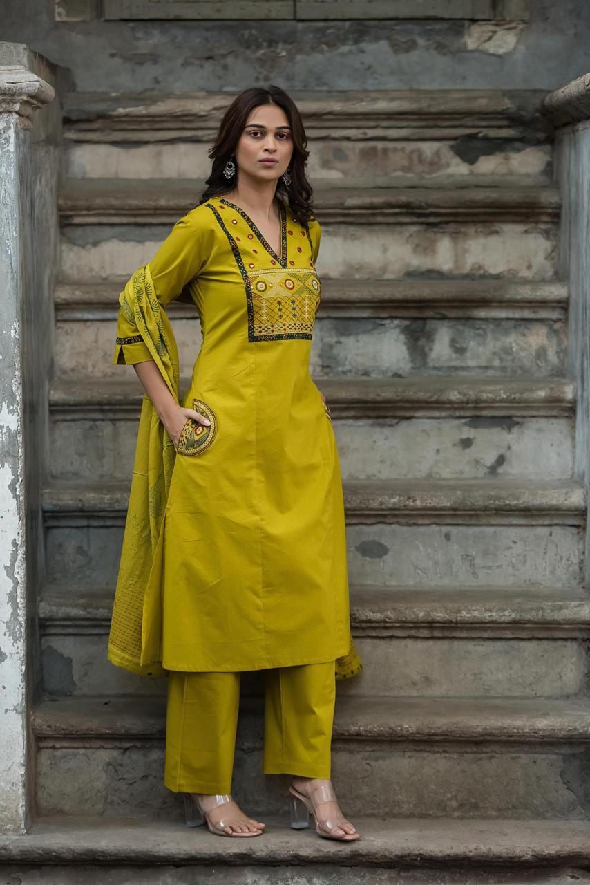 Premium Cotton Solid Base With Embroidery On Neck With Pocket