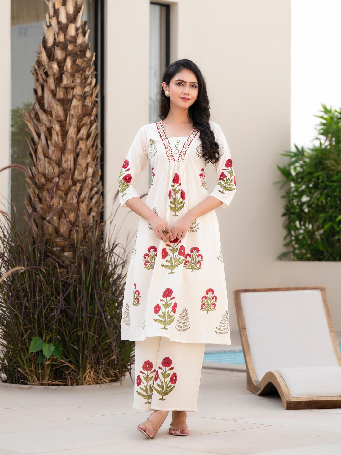 Multi color embroidery work two piece kurta pant set in White base in Cotton flex...