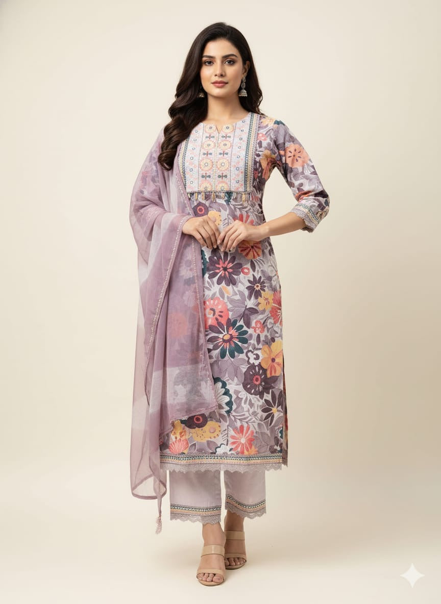Pure Muslin Suit With Floral Organza Dupatta FW059