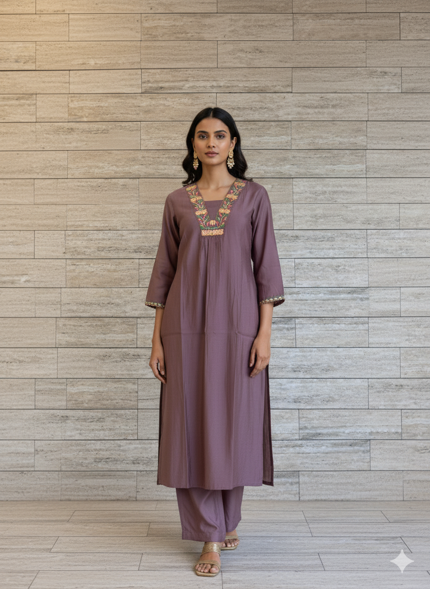 Solid base Muslin based kurta and pant set in purple color with a V shape...