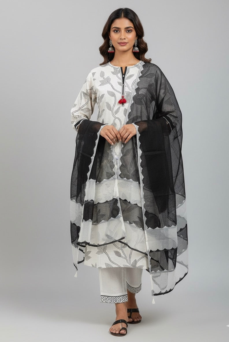 Premium range straight fit pure Cotton hand block dupatta set in cream color with V...