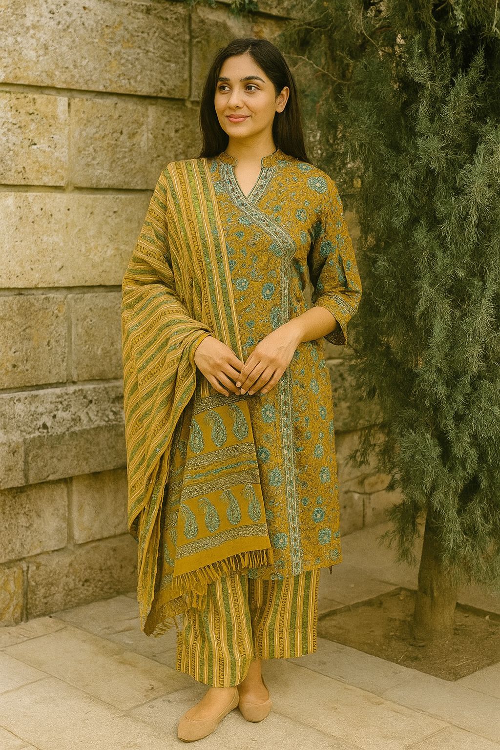 Three Piece Pure Cotton Angrakha Style Dupatta Set FL0201