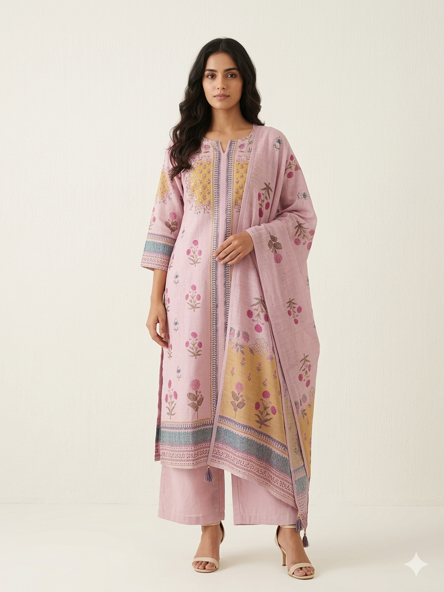 Pure Pink Linen Three Piece Dupatta Set With Lining LN002