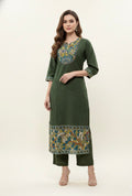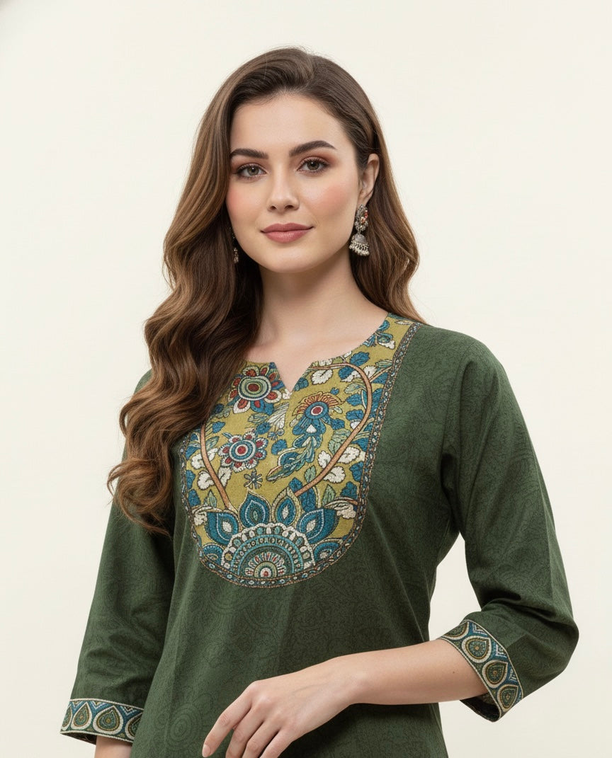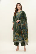 Straight fit pure Cotton Ajrakh print dupatta set in Teal green & Olive Green shade with round neck & straight pants.