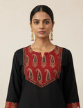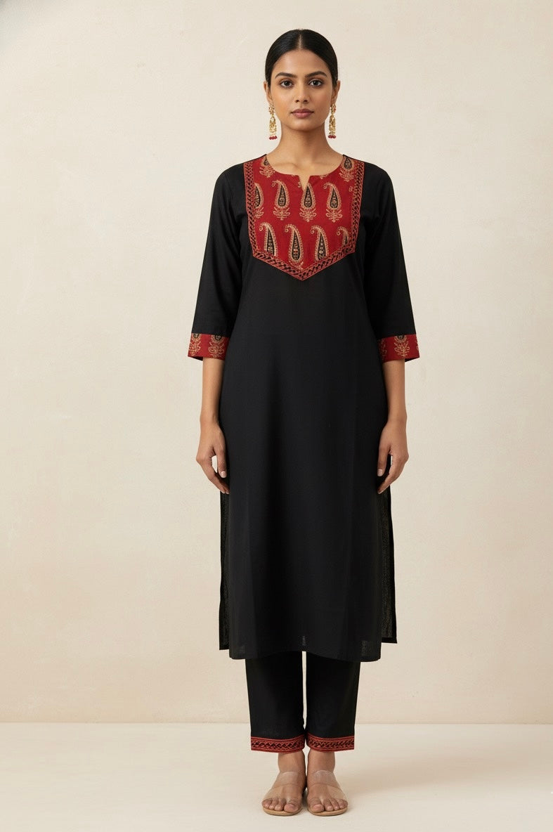 Straight fit pure Cotton two piece kurta pant set in Solid black color with brick red contrast yoke. Perfect for those who loved something new everytime they go for some official meet ups , conferences etc. make a solid impression with our soli base pant set.
