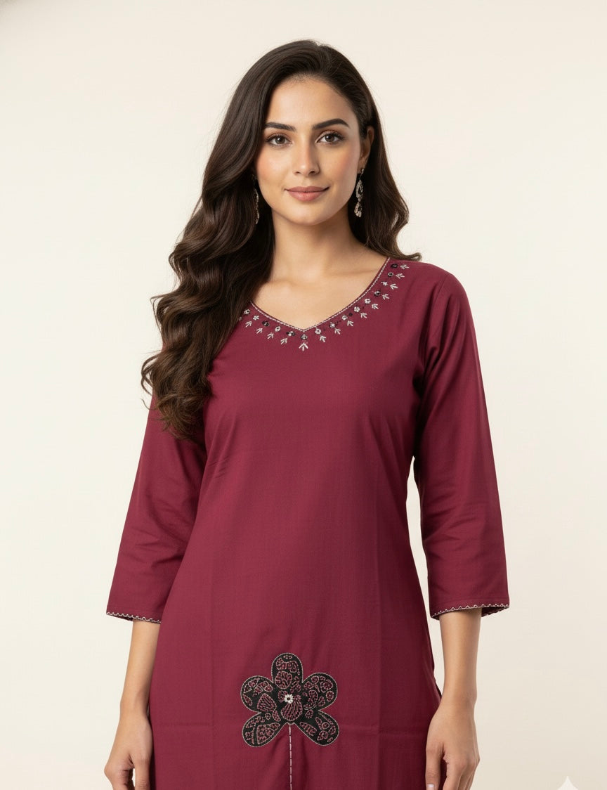 Ajrakh Print Pure Cotton Applique Work Suit. ( Wine ) CS056