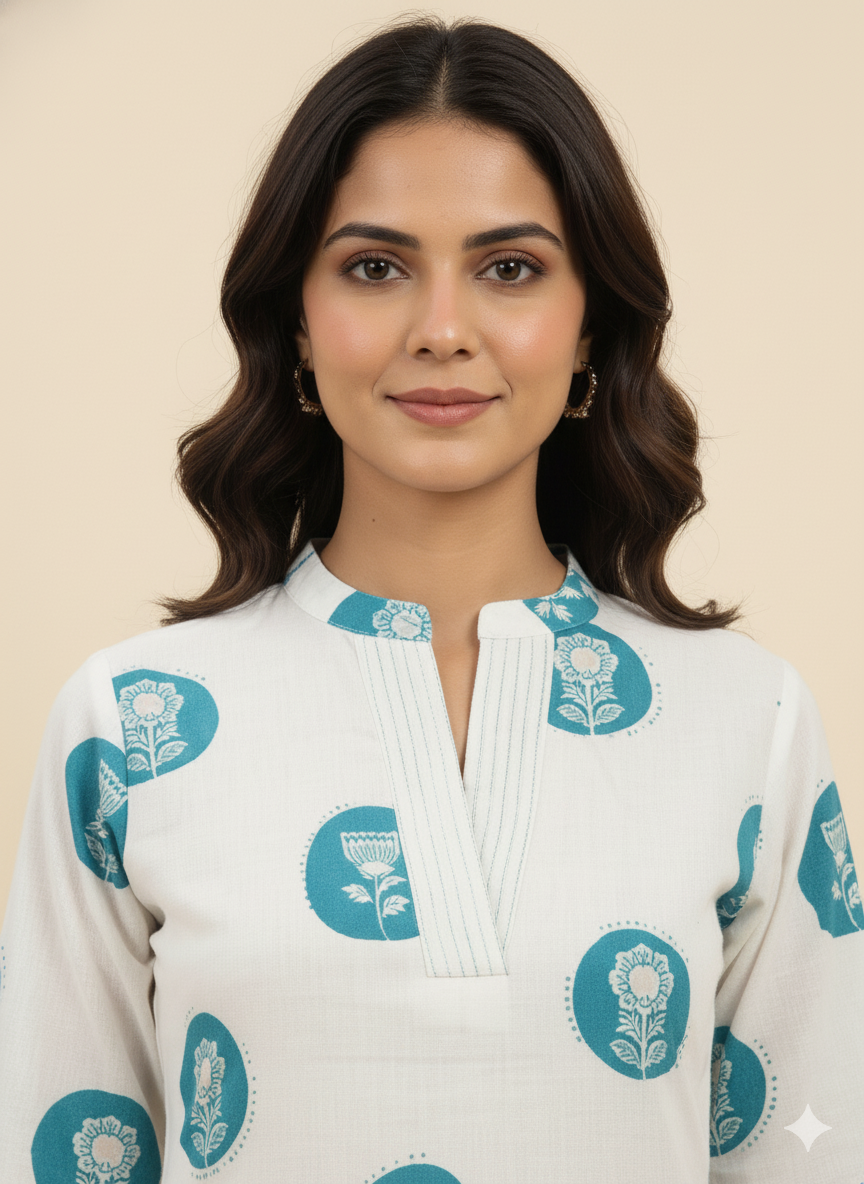 White bawe two piece kurta pant set in pure Cotton Flex fabric with fine buta print has a very classy look.