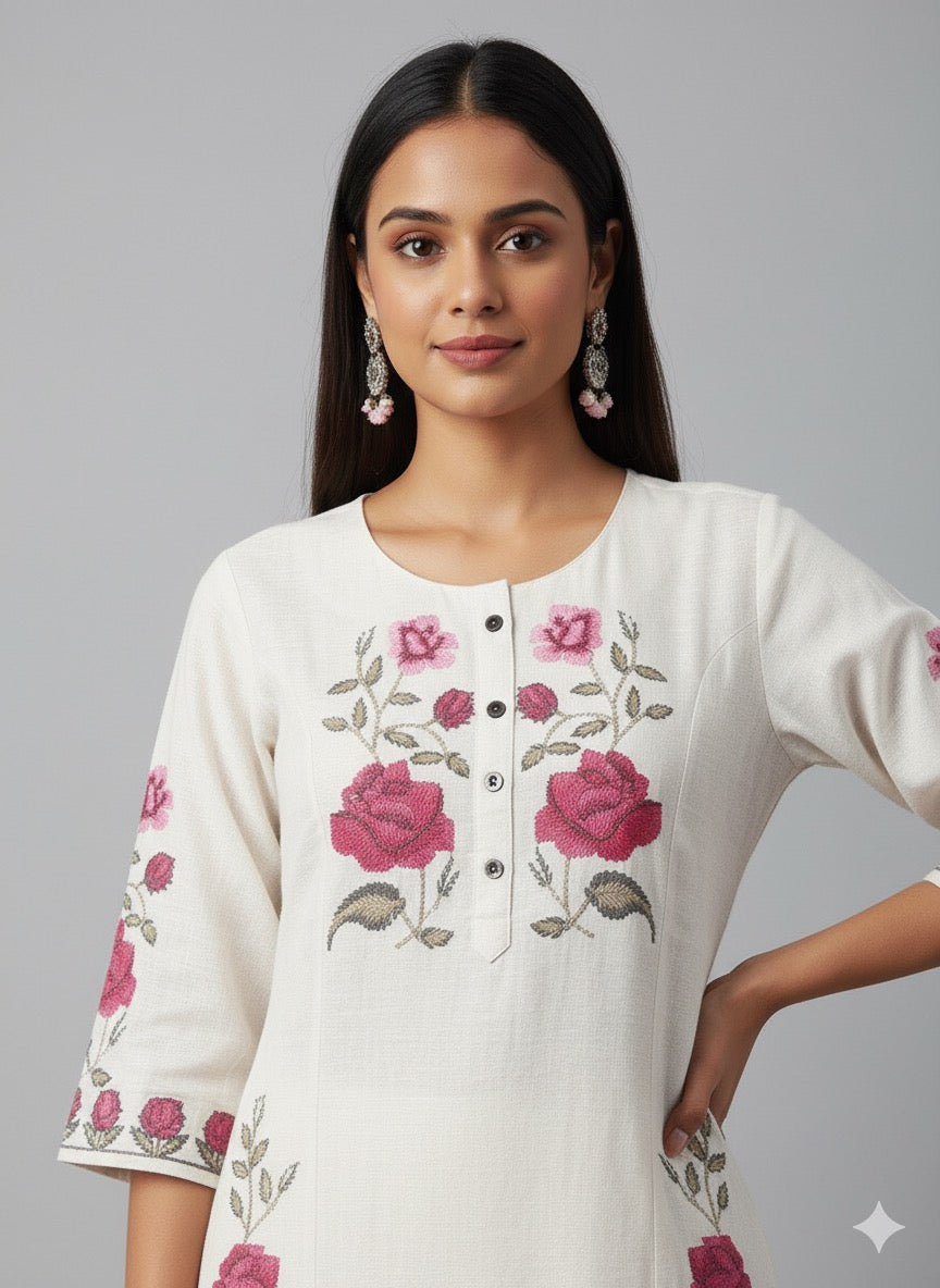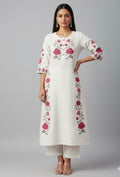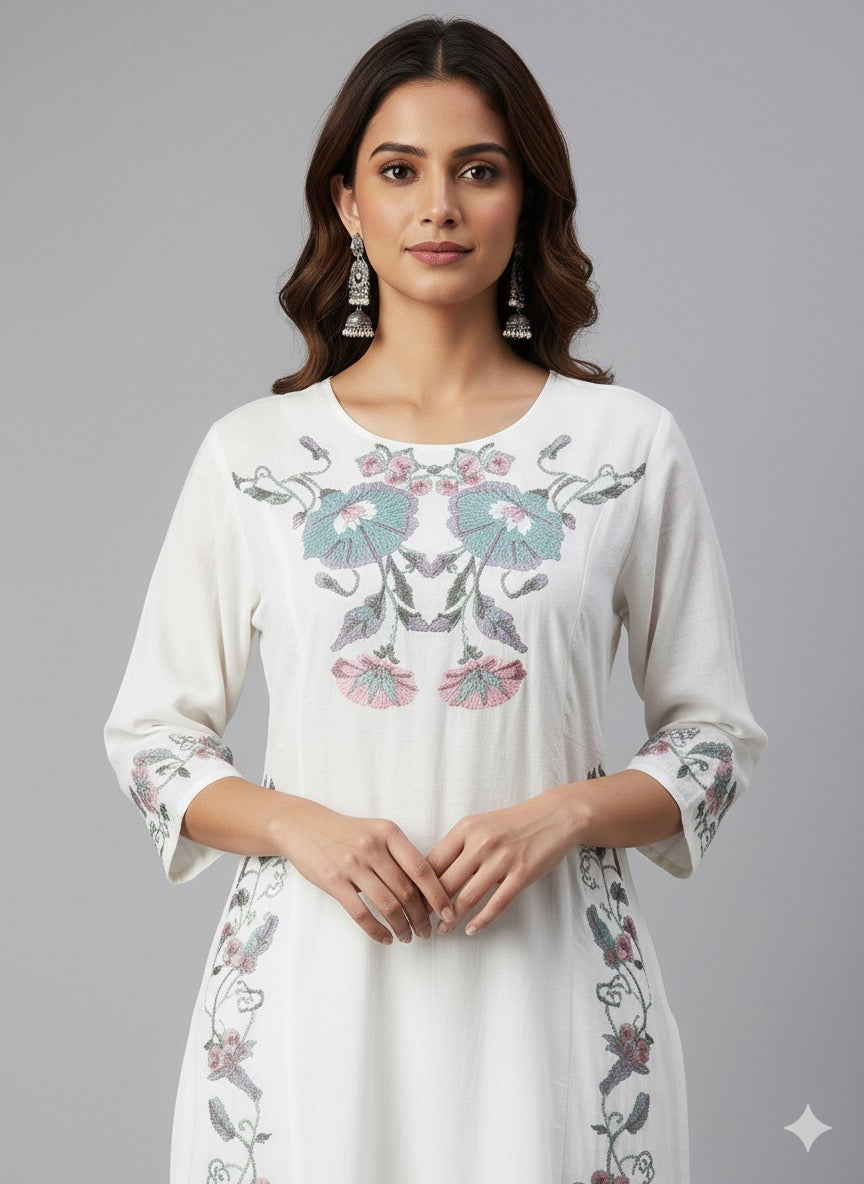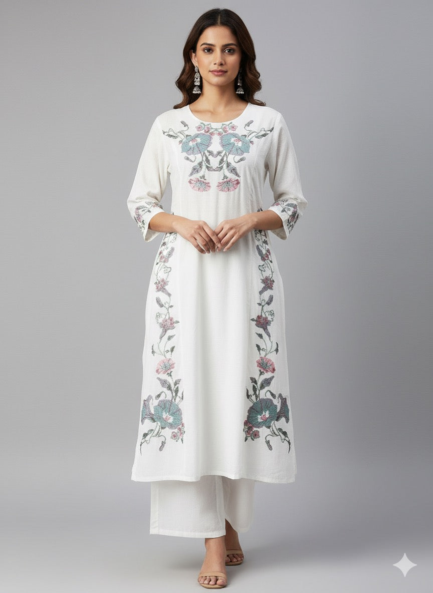 Multi color embroidery work two piece kurta pant set in White base in Cotton flex fabric for you office going purposes or for a cool summer outing.