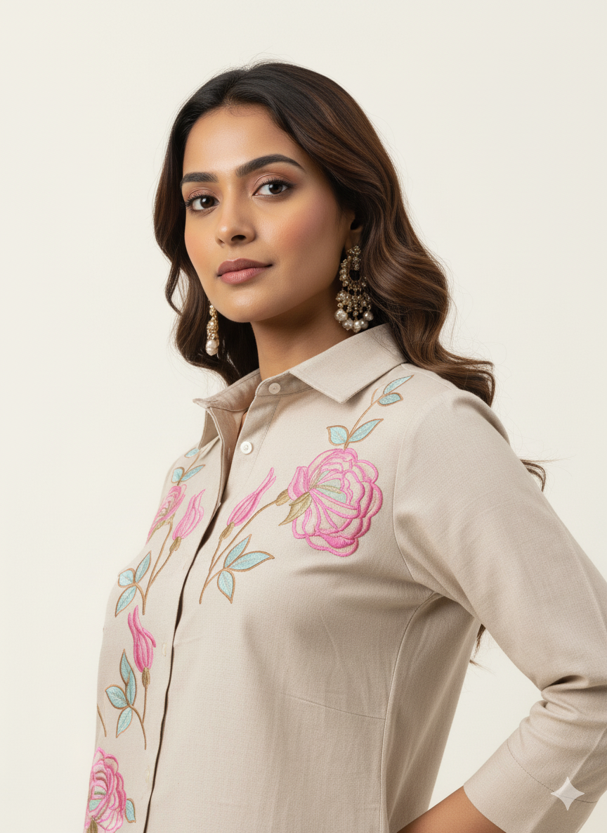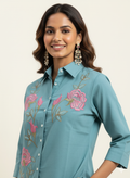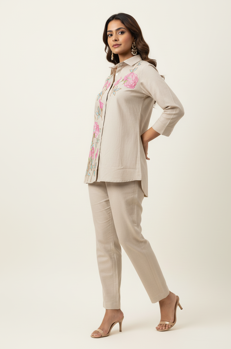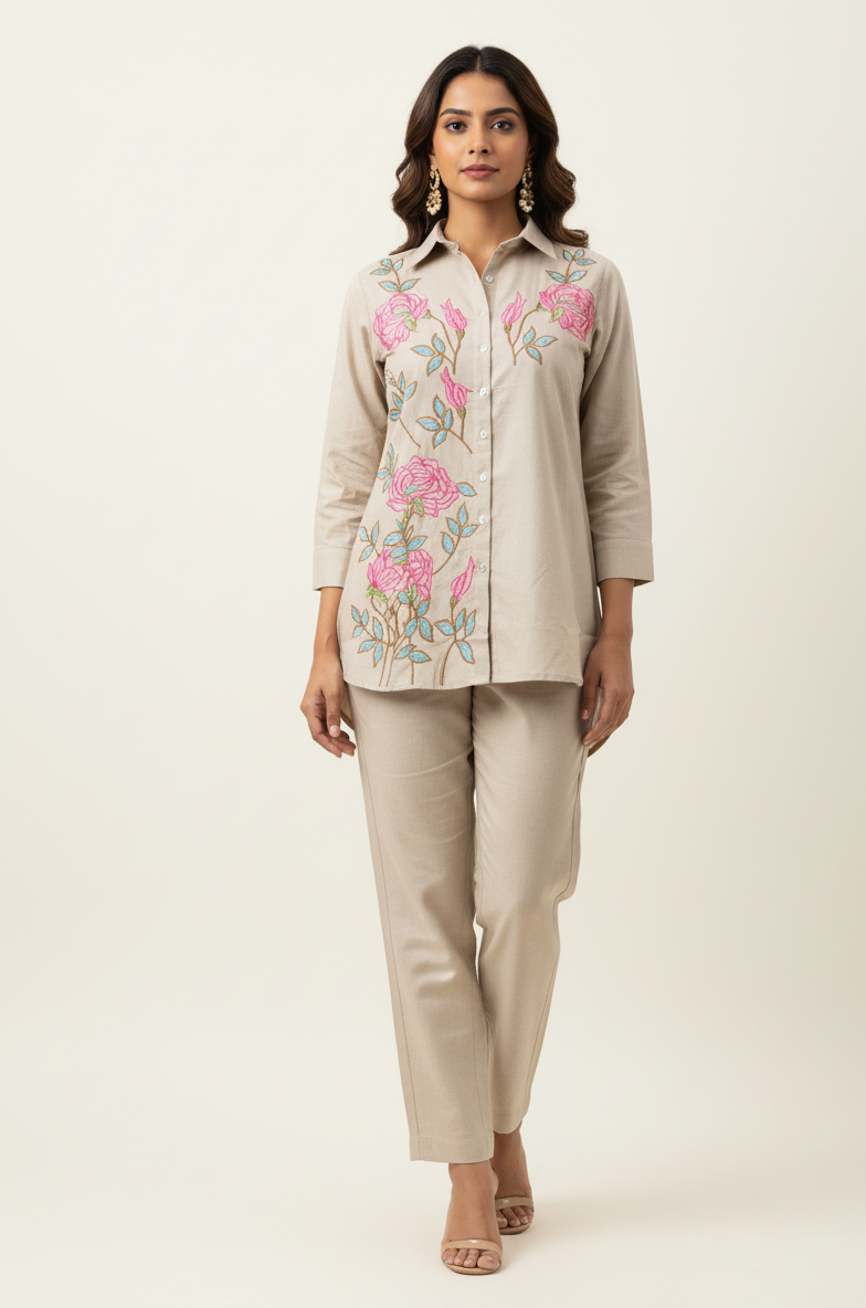 Shirt style two piece Co ord set with beautiful florlal deisgn with multi coloured embroidery work. Giving you a perfect addition to your wardrobe
