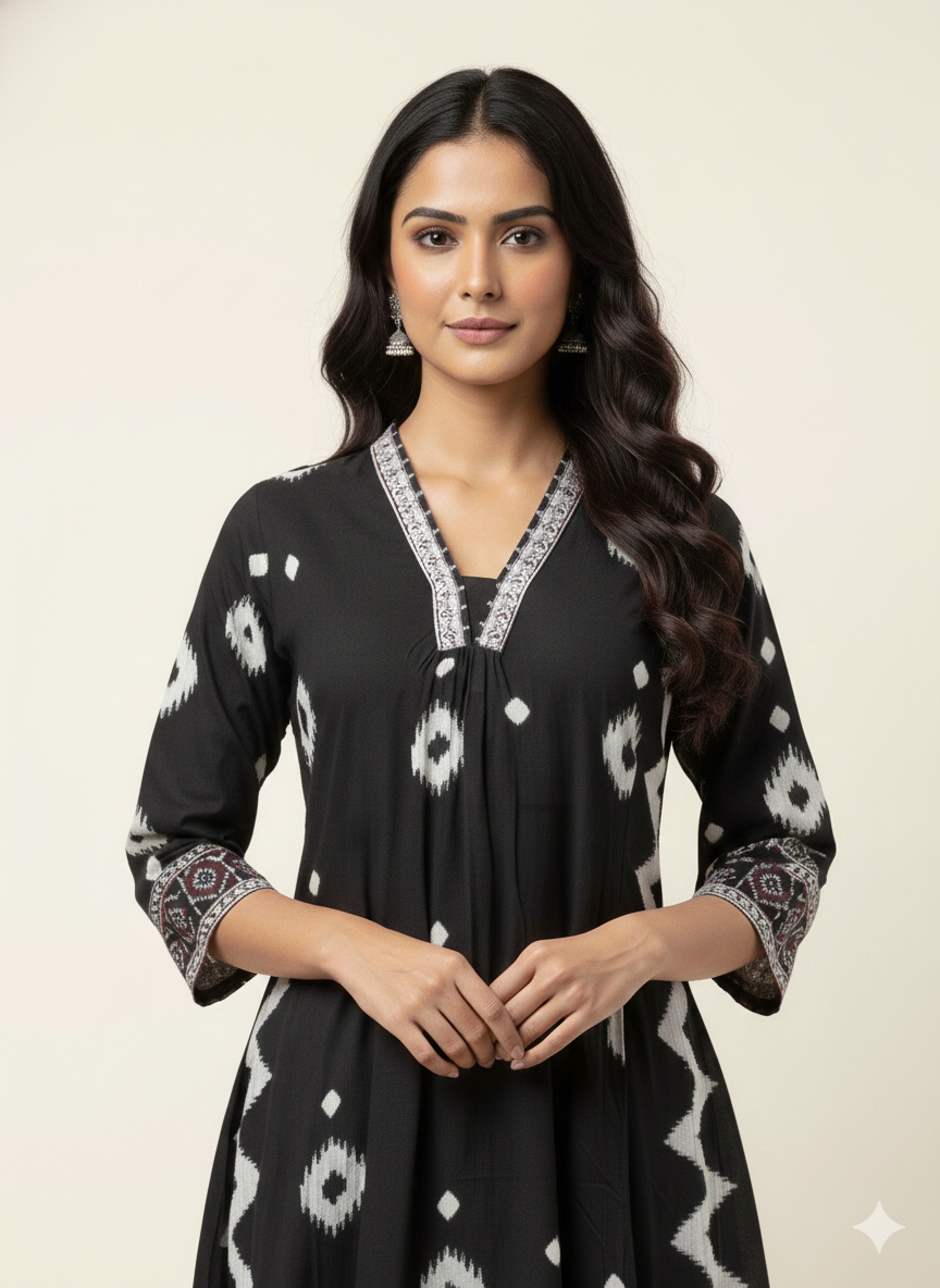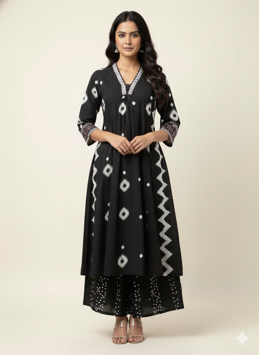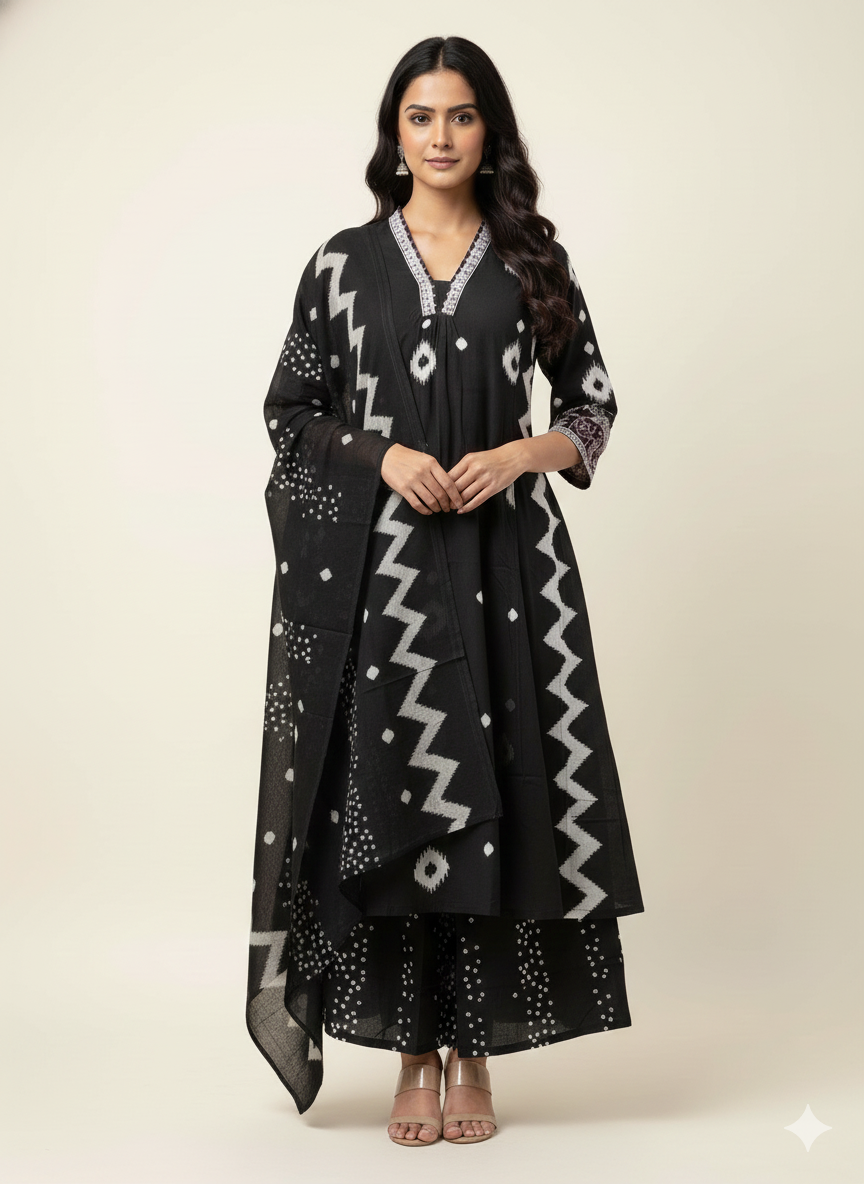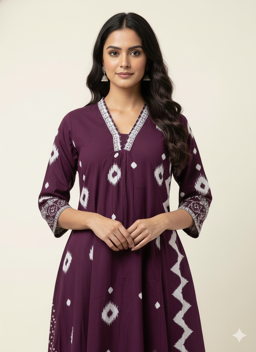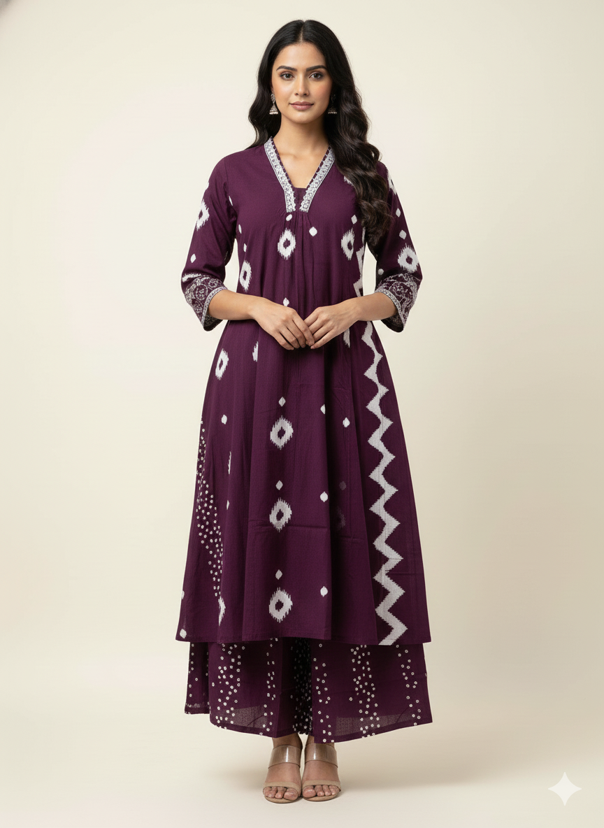 Ikkat Print Flaired Pattern Anarkali Suit In Pure Cotton FL0170