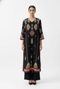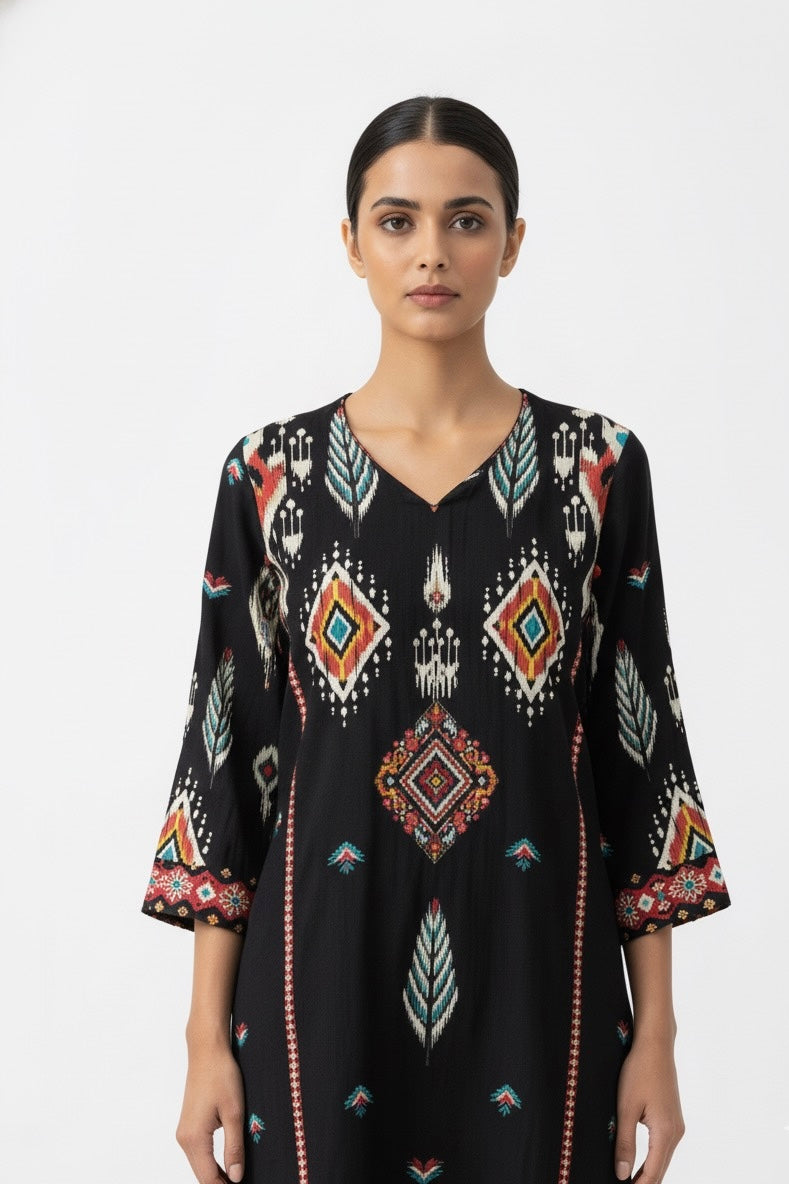 Premium range straight fit pure Rayon three piece dupatta set in Ikkat print with self print overall.