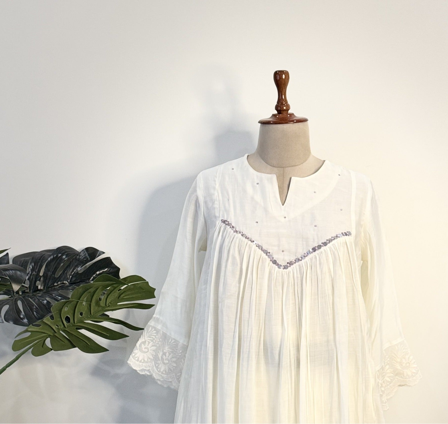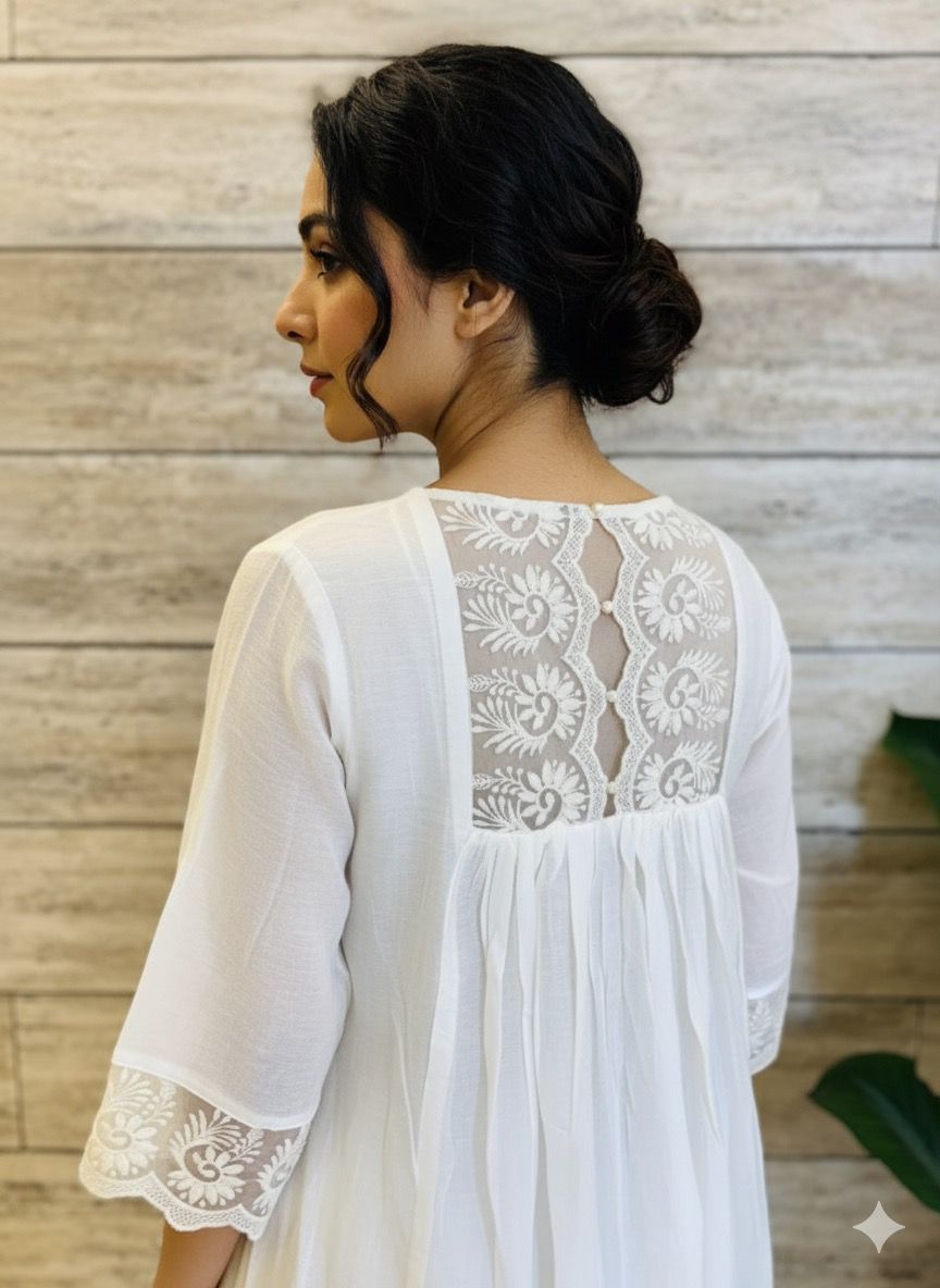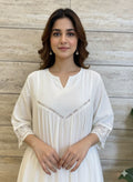 Elegant Gathered festival/party wear solid(plain) kurta set with off white base color with beautiful heavy lace at sleeves and back yoke with faster fastener which create an elite look to the piece and sequin hand work enhance its look.
