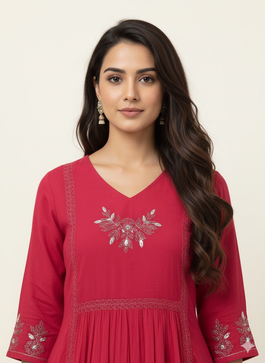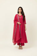 Elegant A- line Gathered festival/party wear solid(plain) kurta set with Ranii base color with lace and heavy hand work at yoke and sleeves and scallop fine heavy embroidery on duppata representing this piece as beautiful good to go piece for any festive occasion