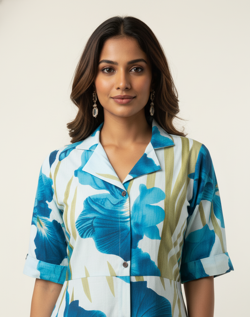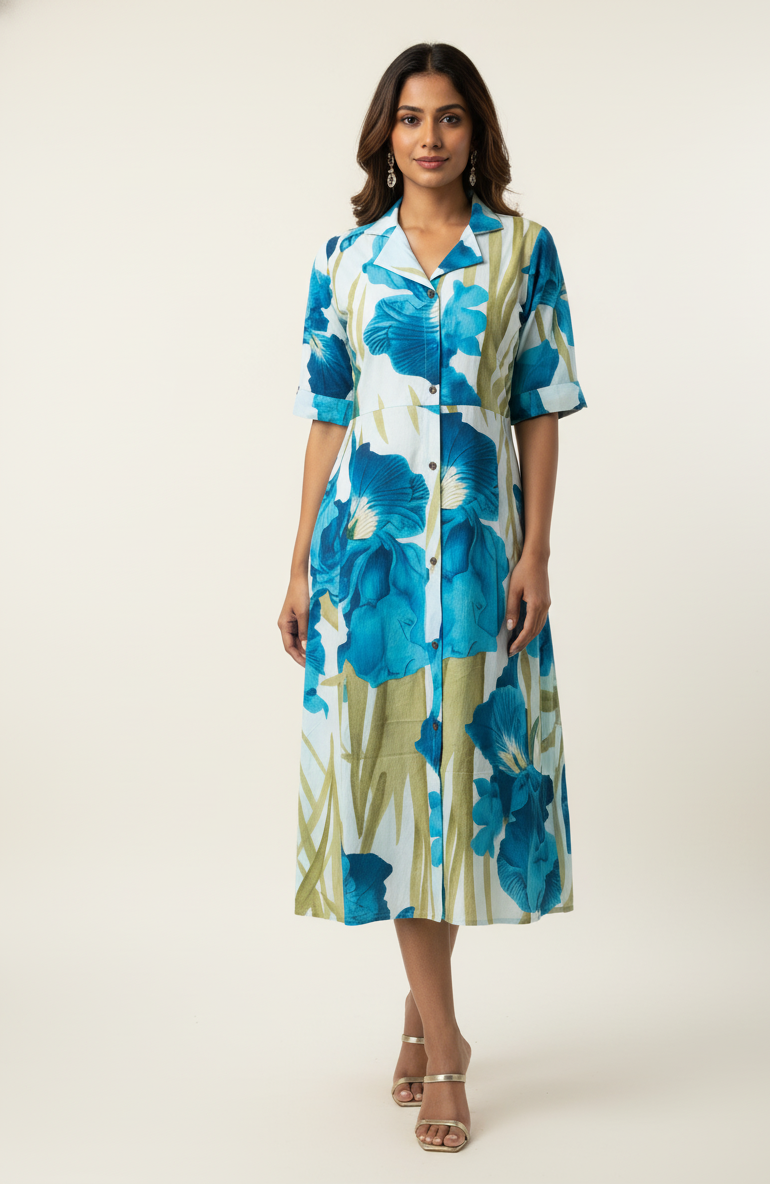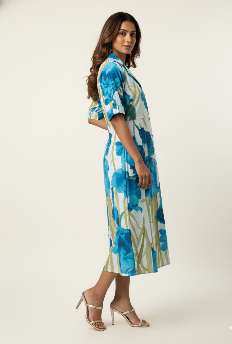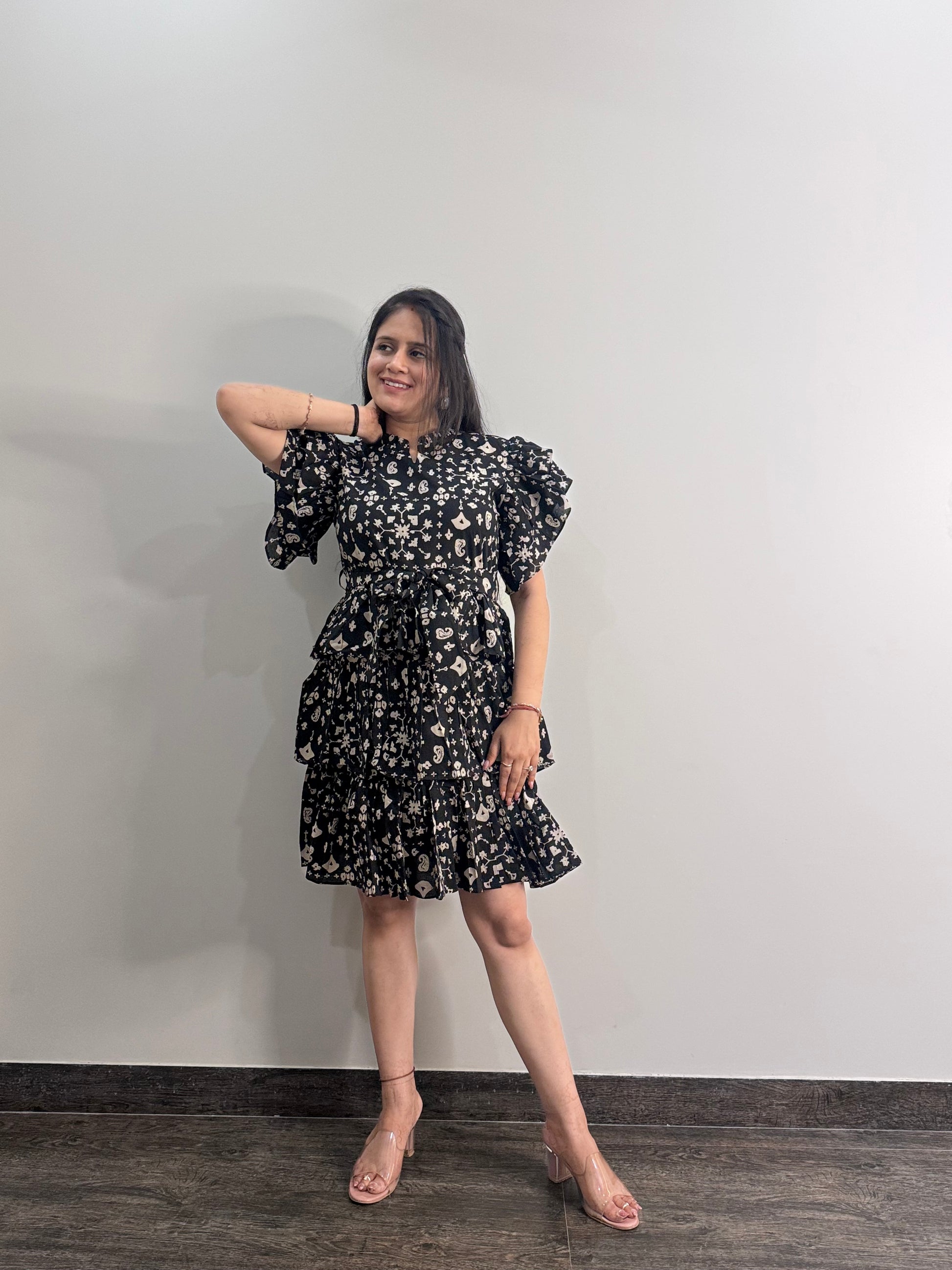 Short length tier dress in very minimal and fine floral print materie based on pure Cotton with broad sleeeves and comes with an adjustable belt.