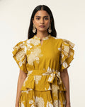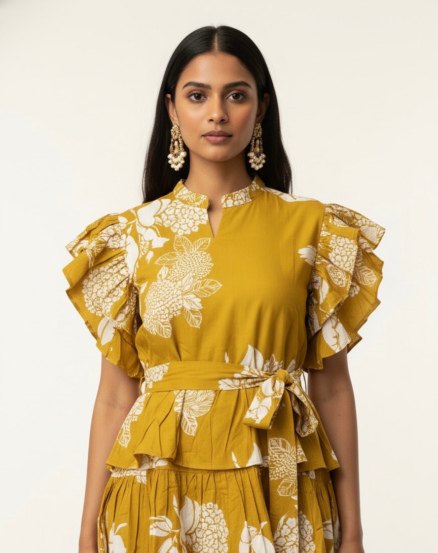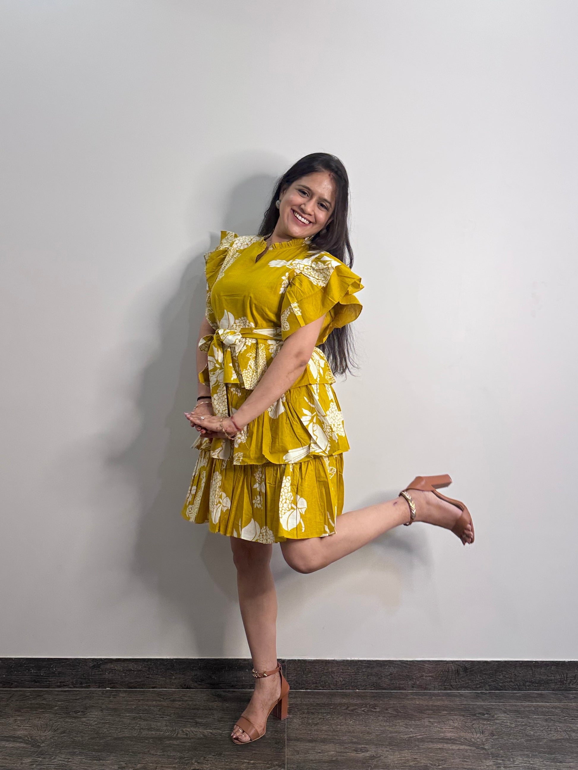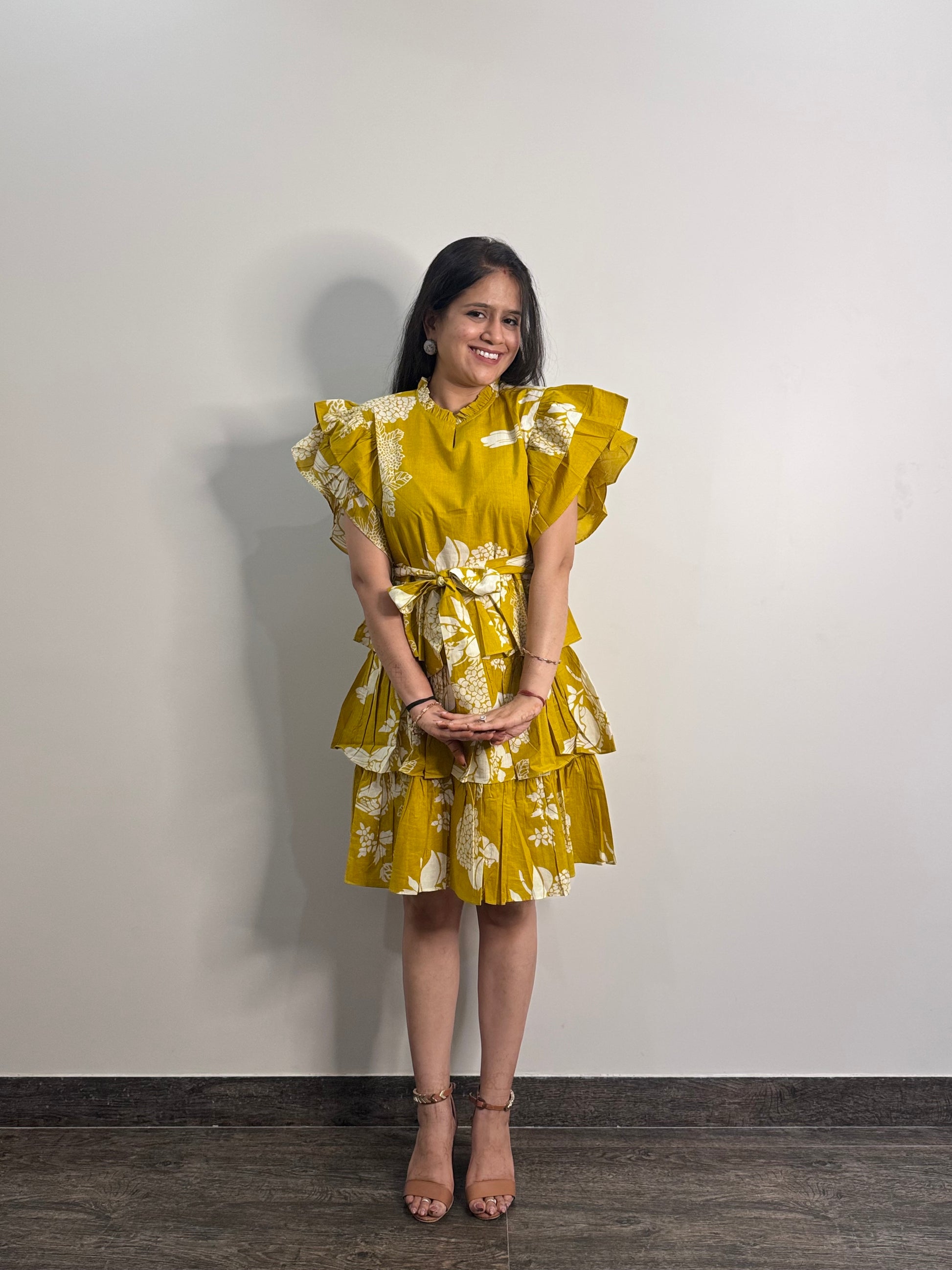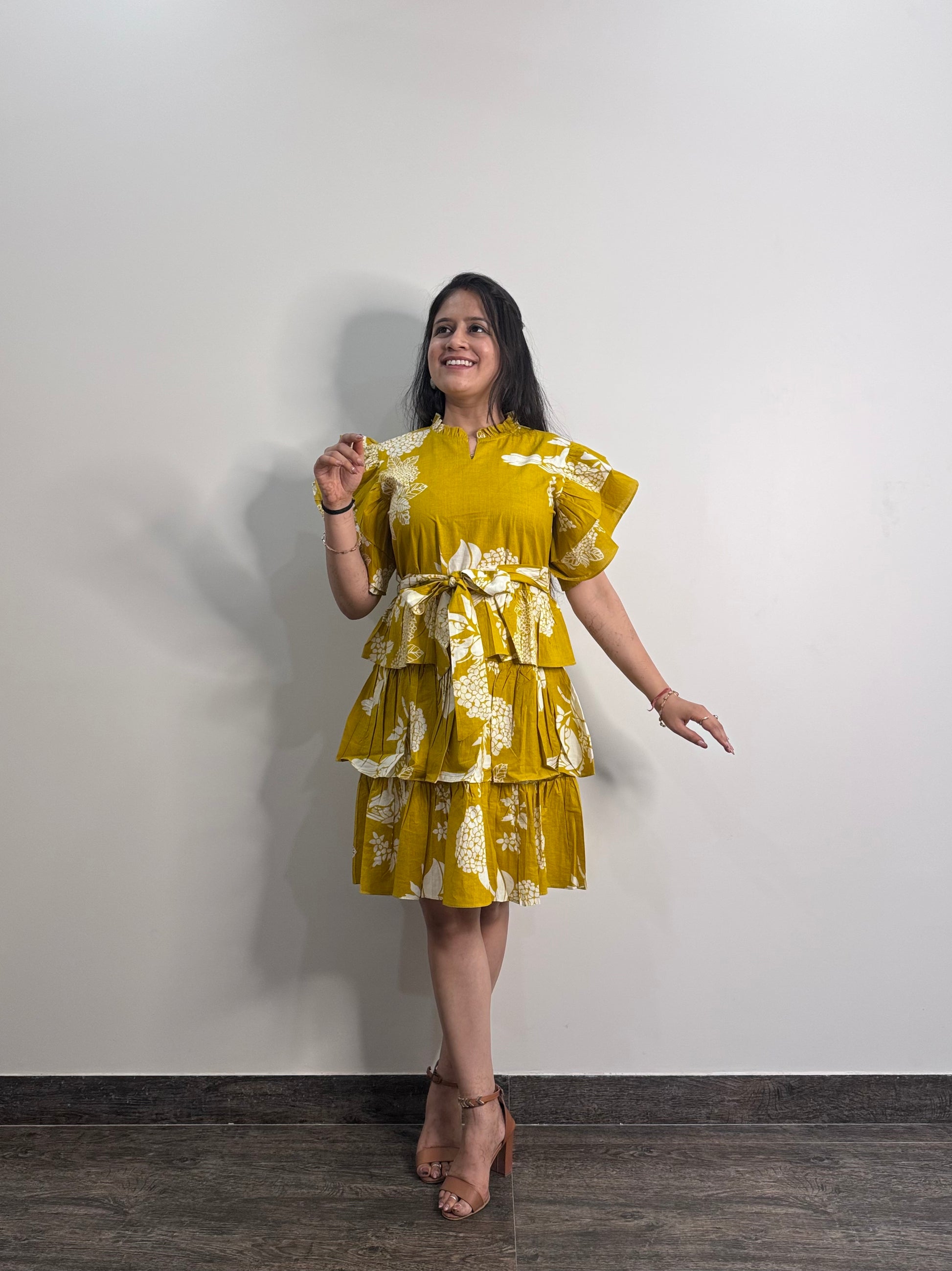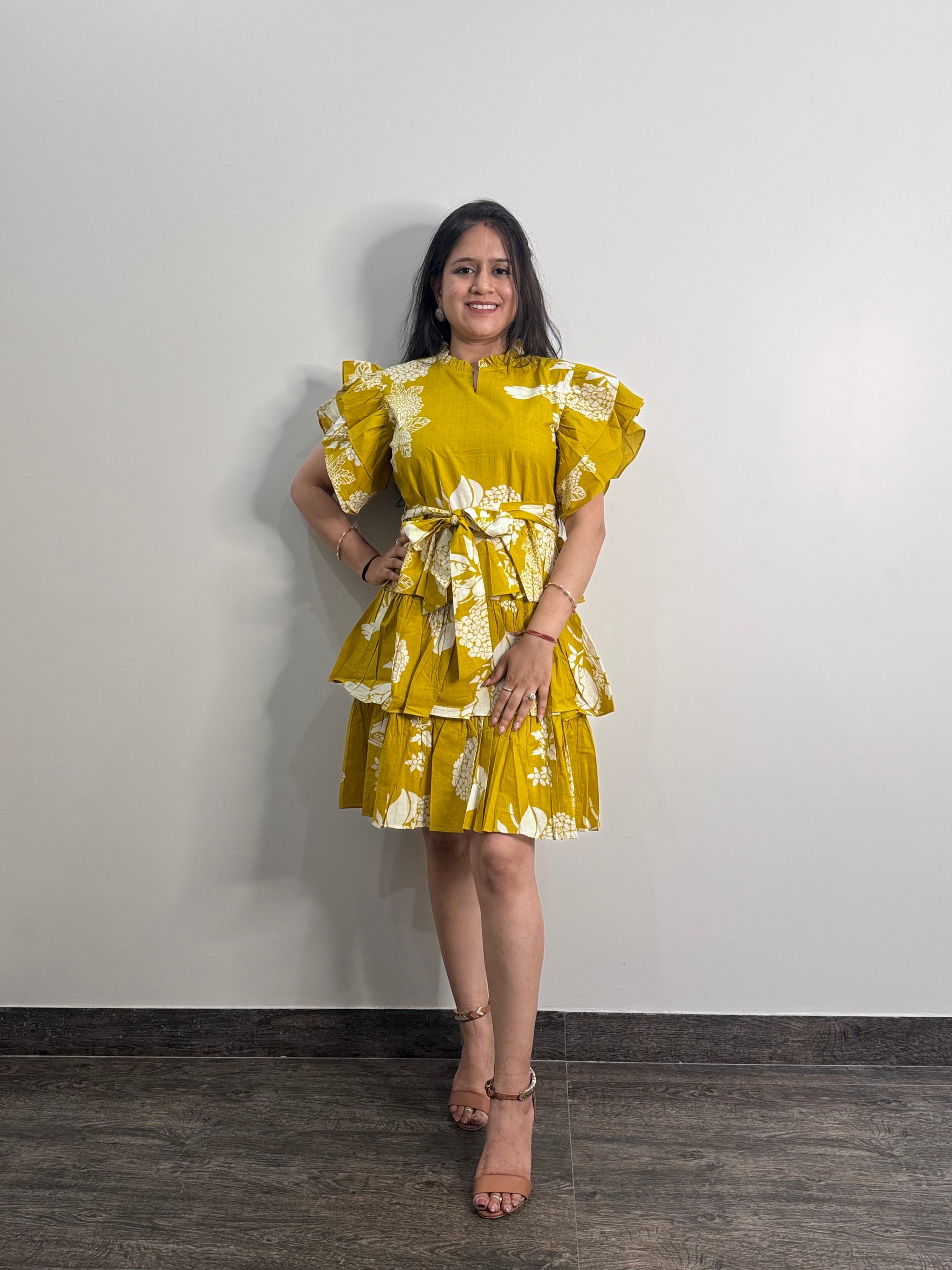 Short length tier dress in Bird and Flower print materie based on pure Cotton with broad sleeves and comes with an adjustable belt.