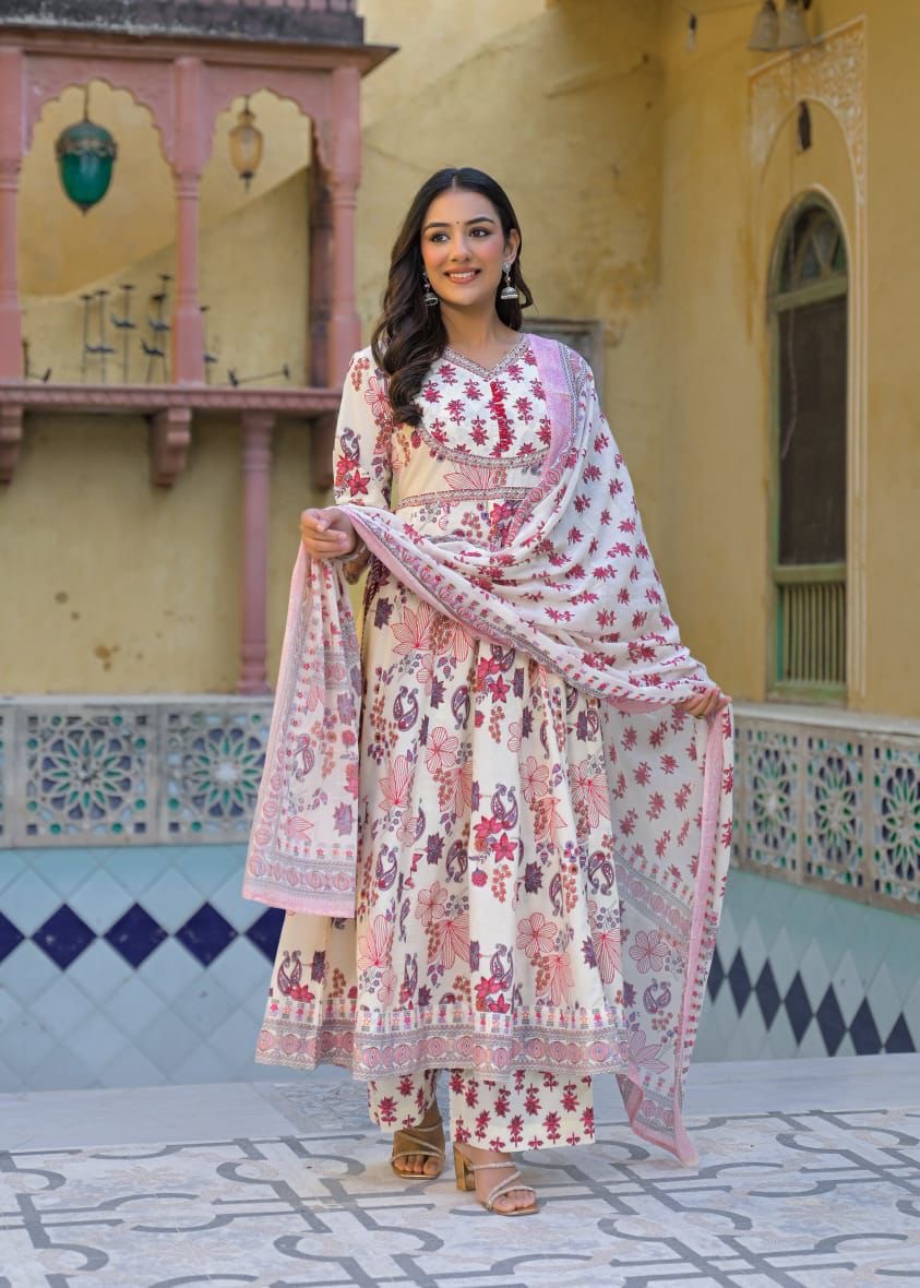 Premium cotton floral print Anarkali Dupatta set