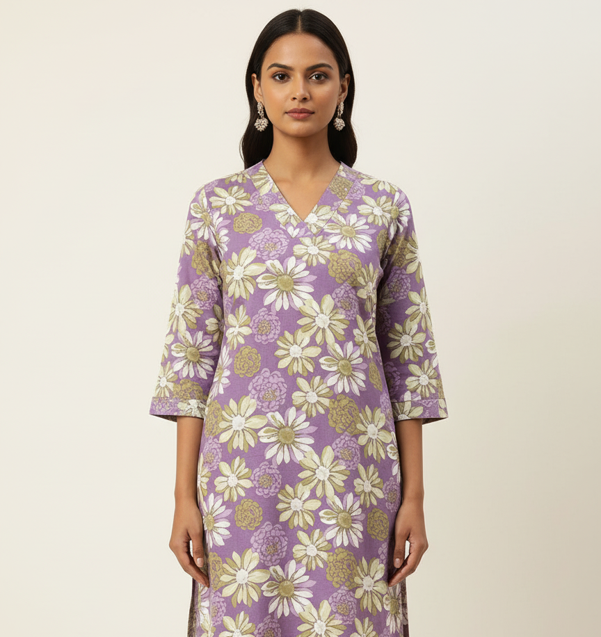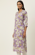 Floral print pure Cotton only kurta in Lavender color base with very elegant flower prints.