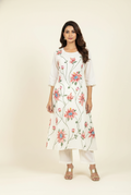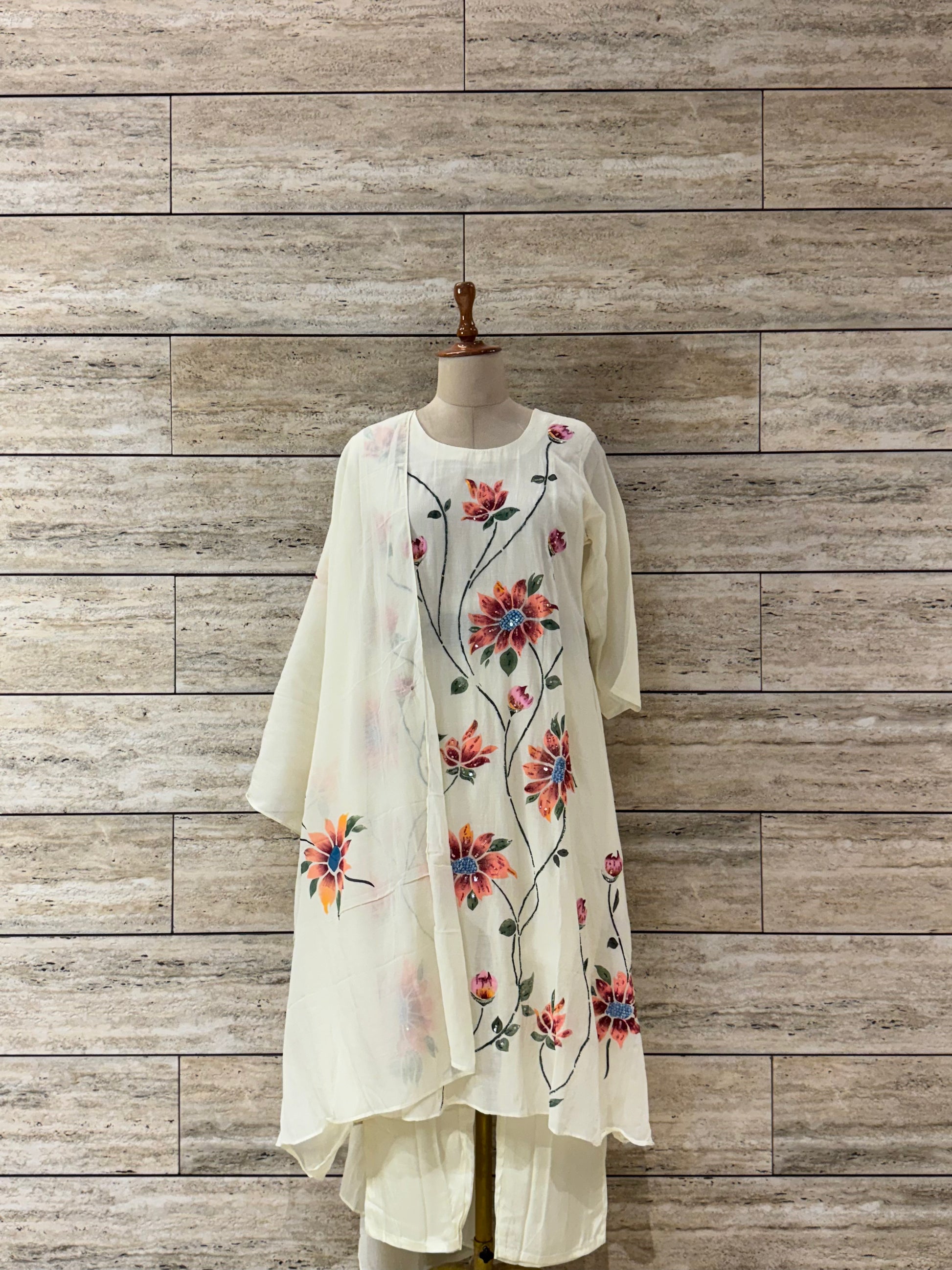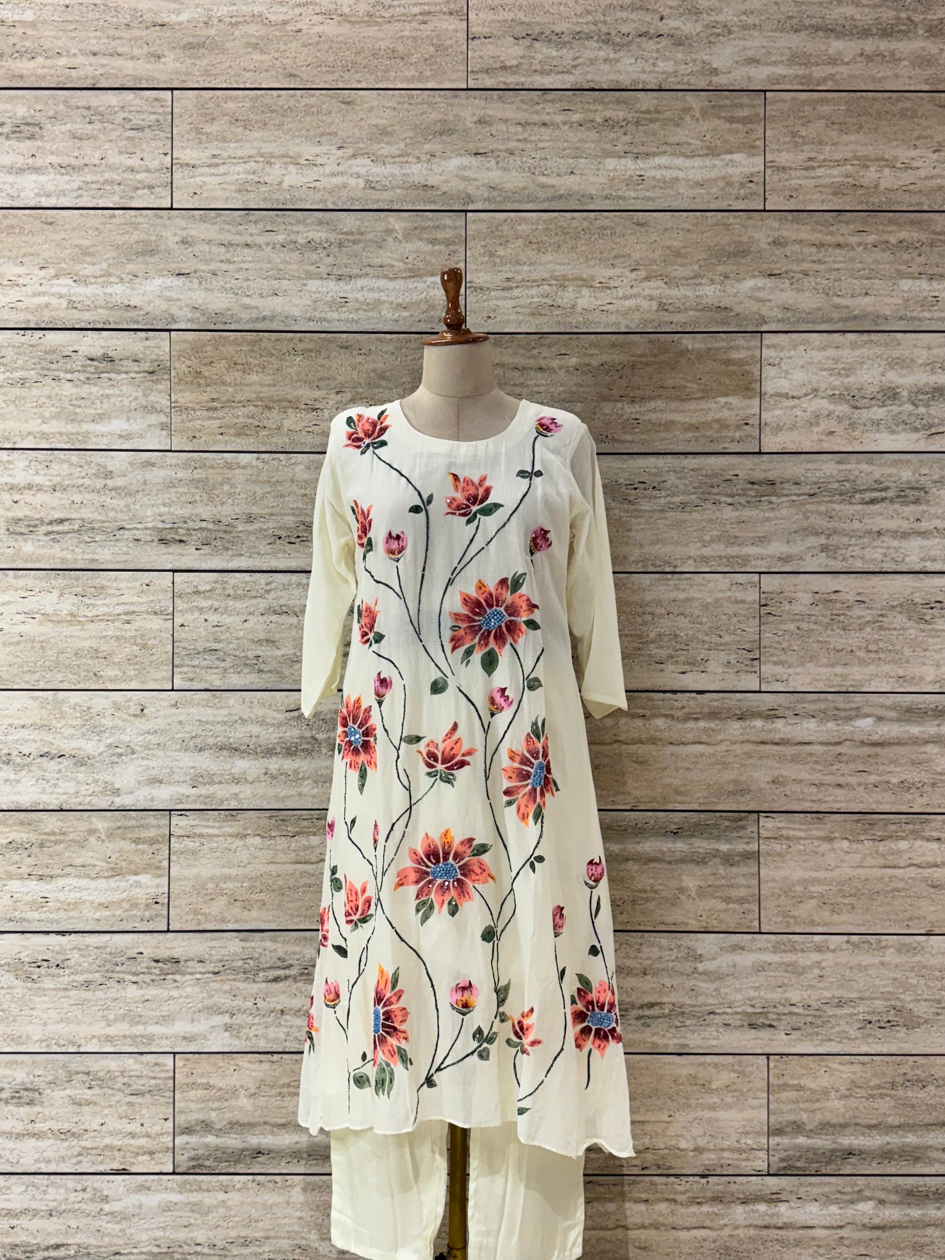 Elegant A-line festival/party wear kurta set with such a peaceful cream base color with hand painted flower motives, even with hand work minor detailing at motif gives it very rich look.