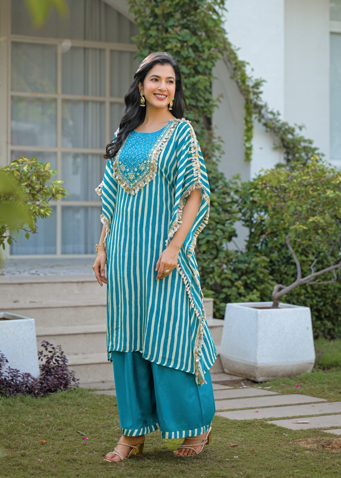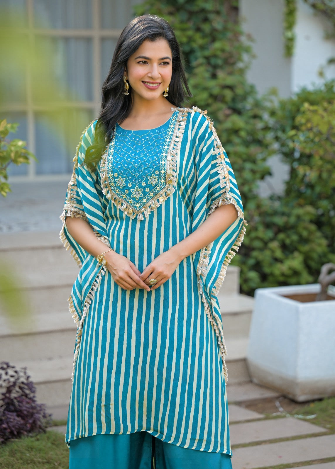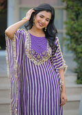 Classy and modern Kaftan festival/party wear two-piece set with such a beautiful color combination in stripe of violet and creme color with golden laces and small accessories around solid base embroidered yoke, same at edges of kaftan sleeves which gives it very rich look.