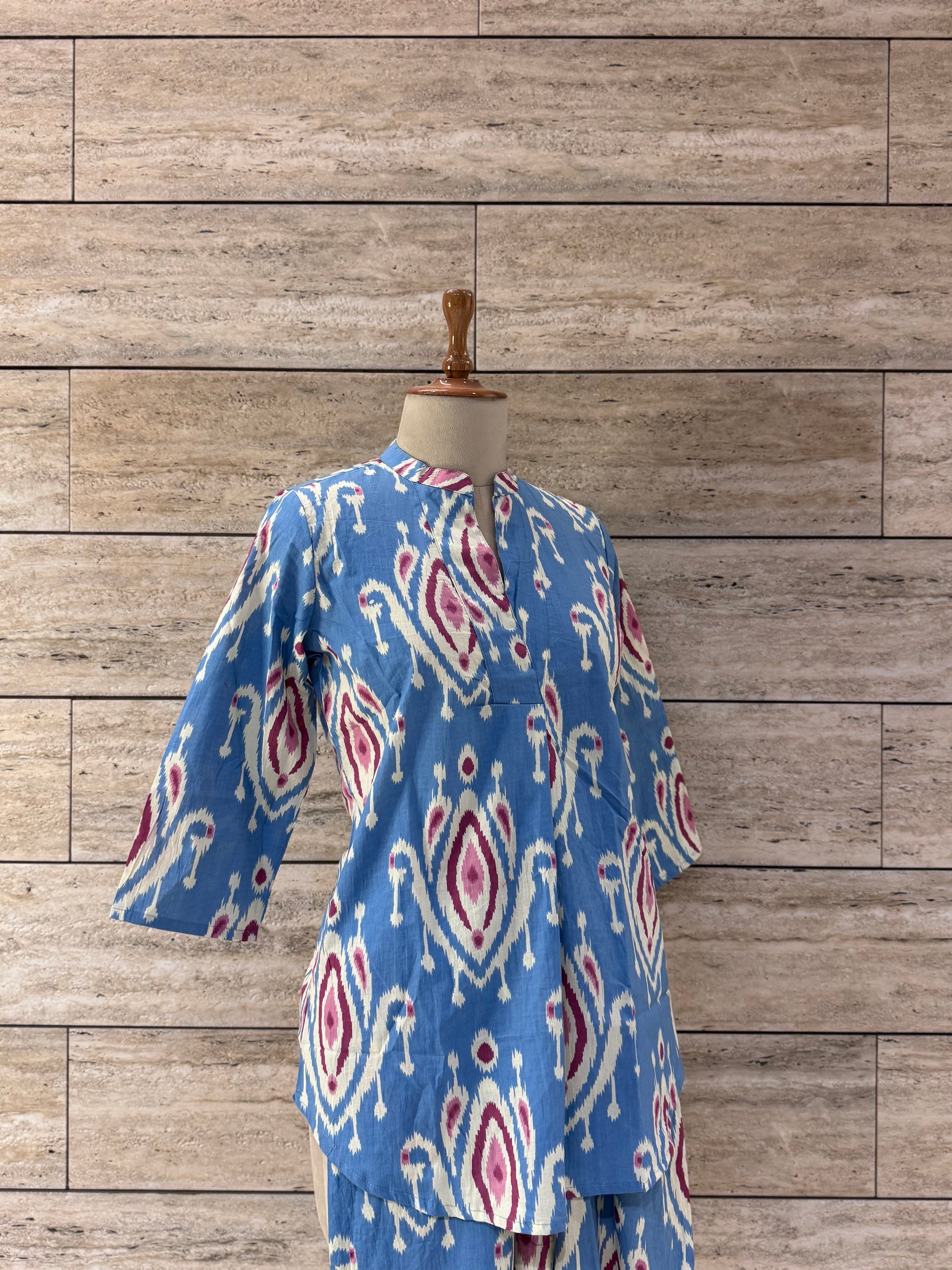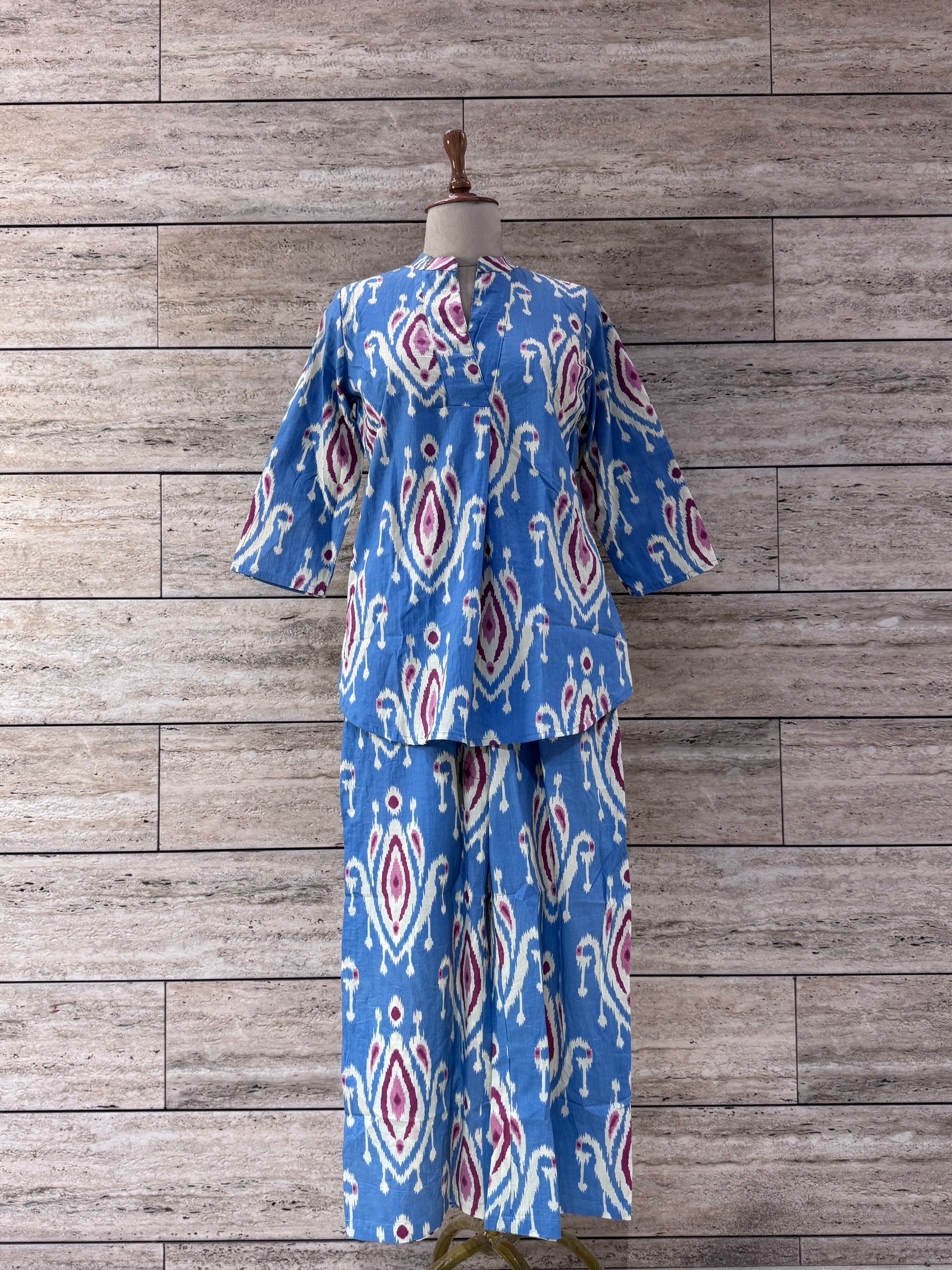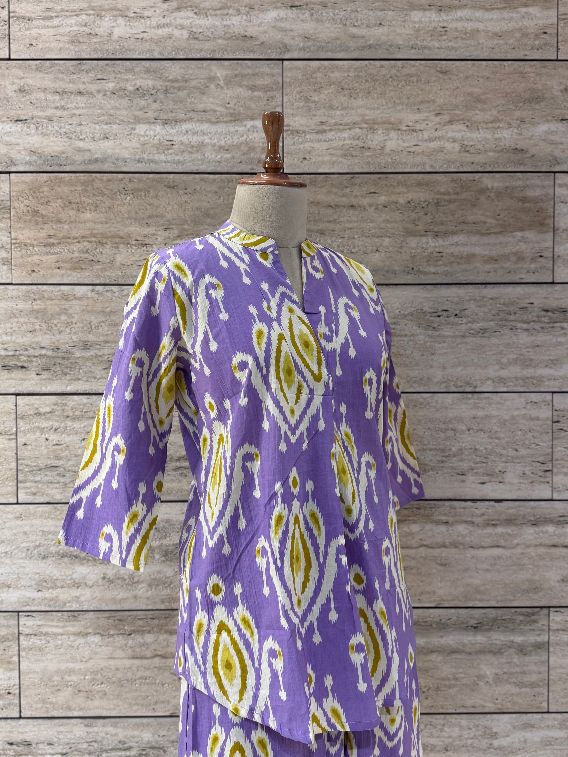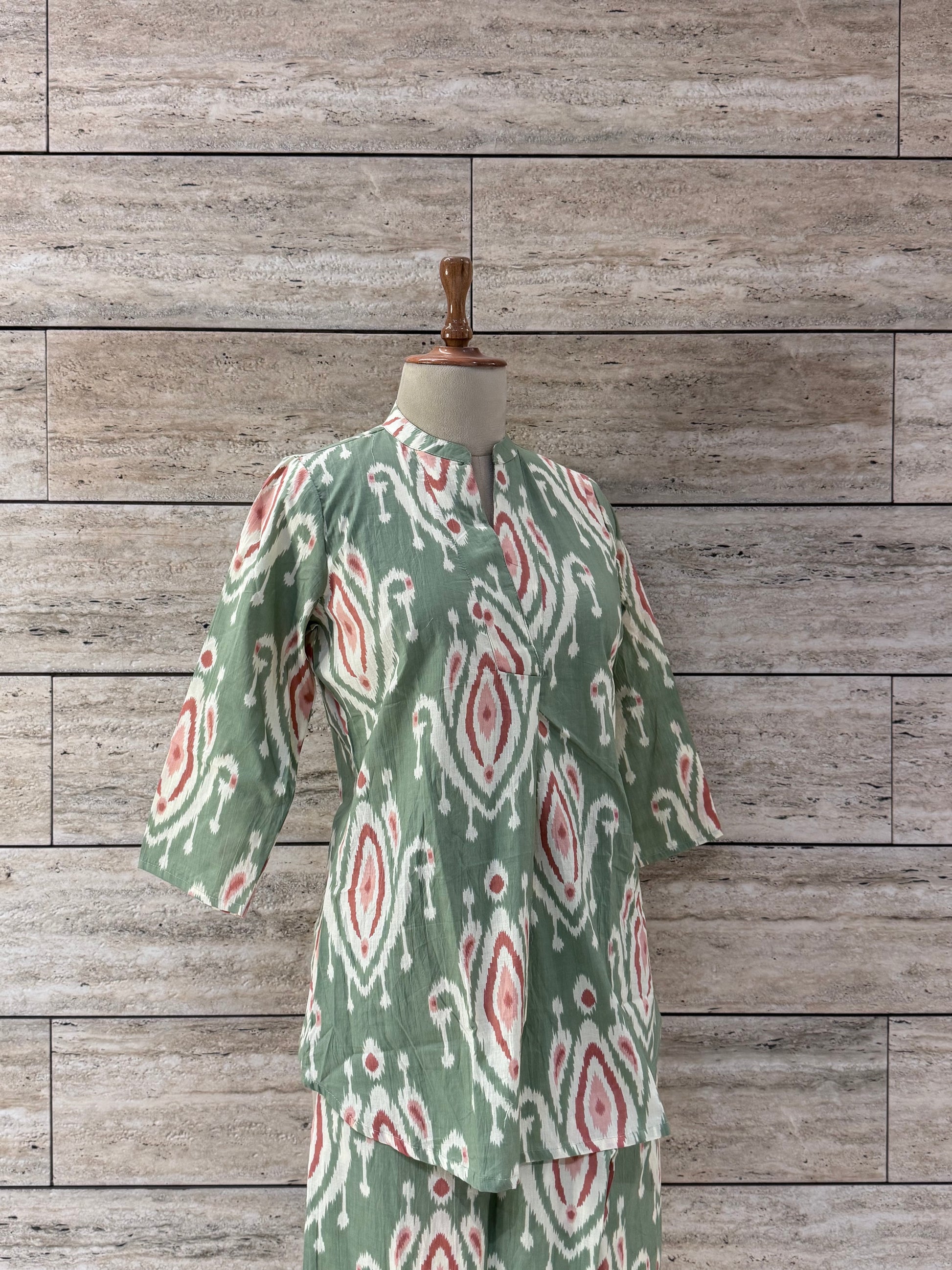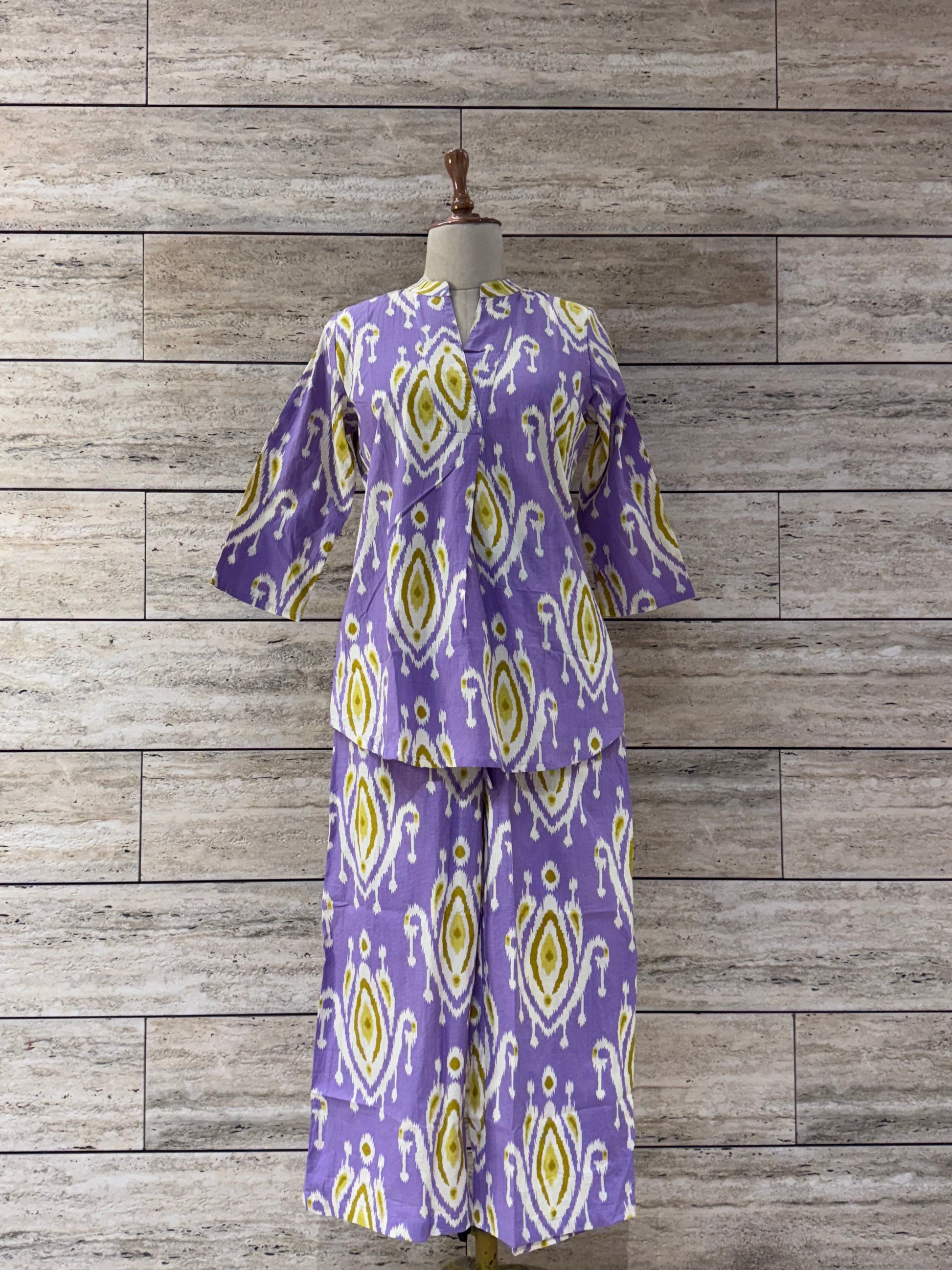 Pastel color Ikkat print pure Cotton Co Ord sets with short length top and Plaazo pants. Perfect for this summer season.