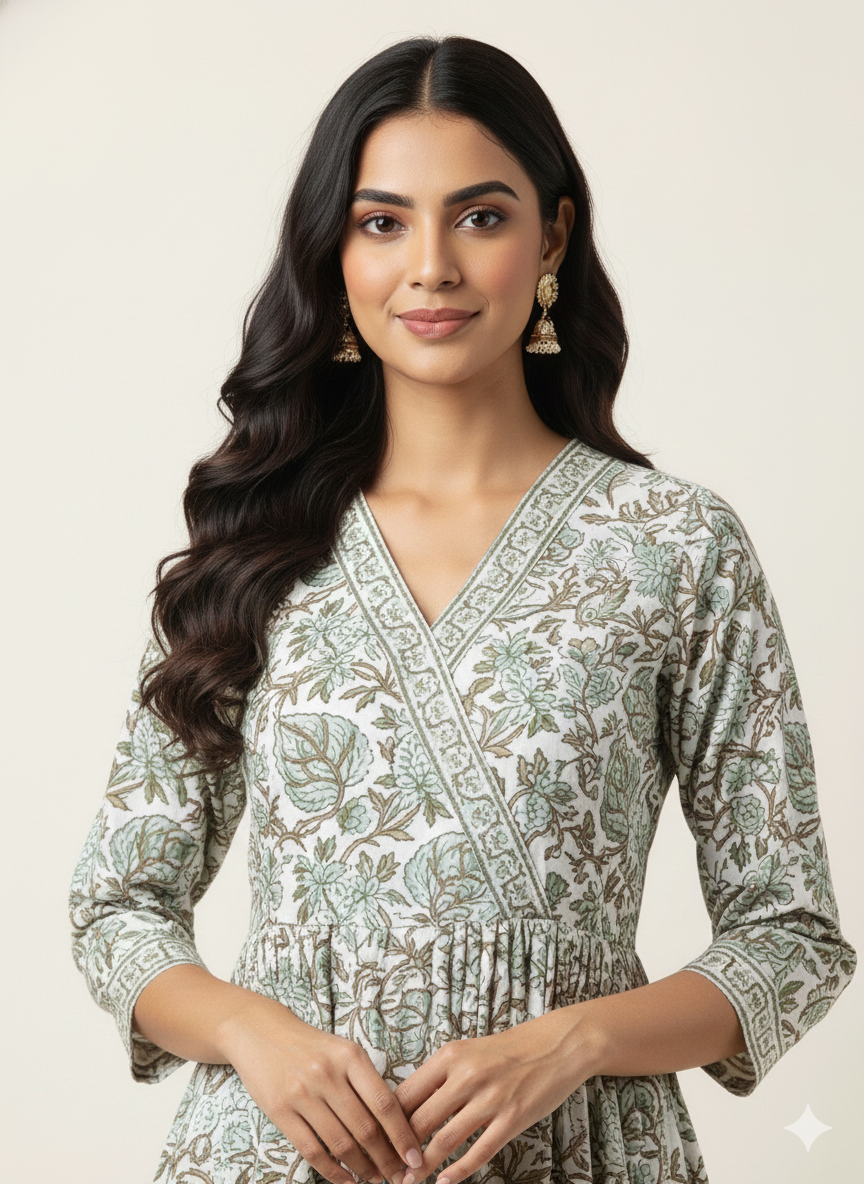 White Base Hand Block Floral Print Dupatta Set LC025
